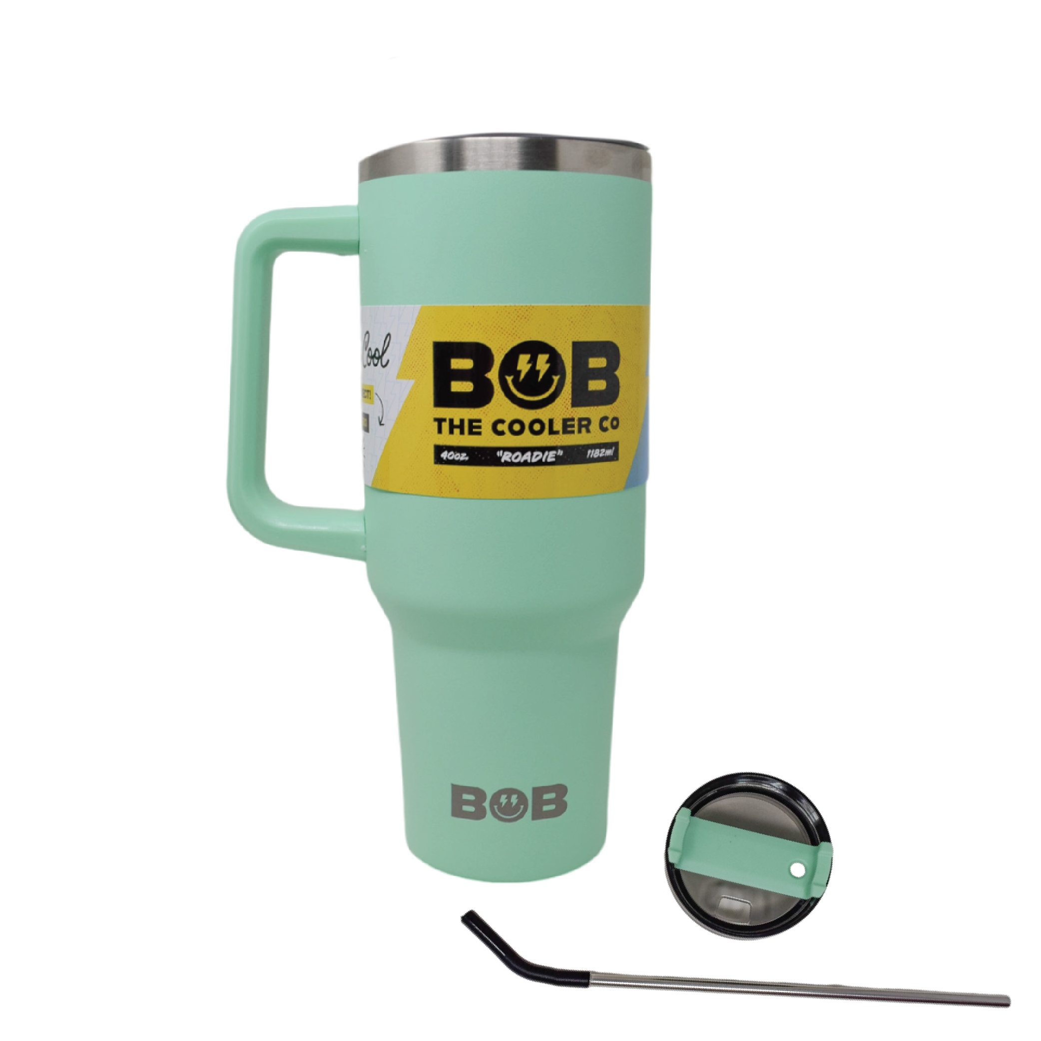 BOB THE COOLER CO - 40oz "Roadie" Heavy Duty Double Wall Vacuum Insulated Tumbler with Straw and Handle, Made of Stainless Steel, Great for Travel, Beach, & More