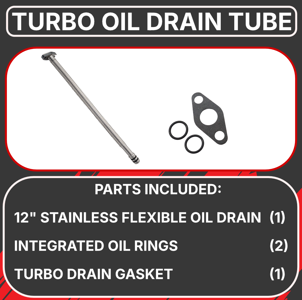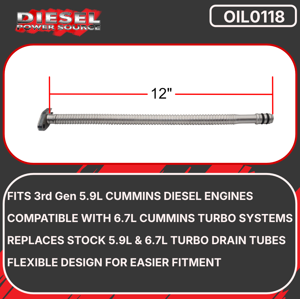 Upgrade your Cummins turbocharger oil drainage system with the Diesel Power Source 12"" Stainless Steel Flexible Turbo Oil Drain Tube, engineered to provide superior durability and performance compared to rigid factory drain lines. This premium flexible drain tube eliminates the common failure points associated with hard-line oil drains, accommodating engine movement, thermal expansion, and vibration while maintaining consistent oil flow from your turbocharger back to the oil pan. The 12-inch length provides optimal routing flexibility for various Cummins applications including 5.9L 12V/24V, 6.7L, ISX, and marine/industrial engines.
