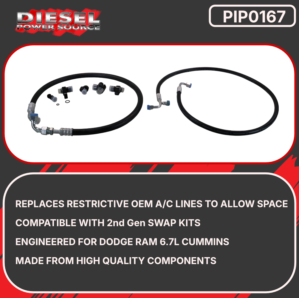 Performance Applications: Specifically designed for diesel enthusiasts performing compound turbo installations, twin turbo conversions, or 2nd generation Cummins engine swaps where original A/C line routing creates clearance conflicts. The relocation design maintains optimal refrigerant flow while repositioning lines away from turbocharger components, exhaust manifolds, and other performance modifications. Essential for maintaining air conditioning functionality during engine bay modifications and performance upgrades.