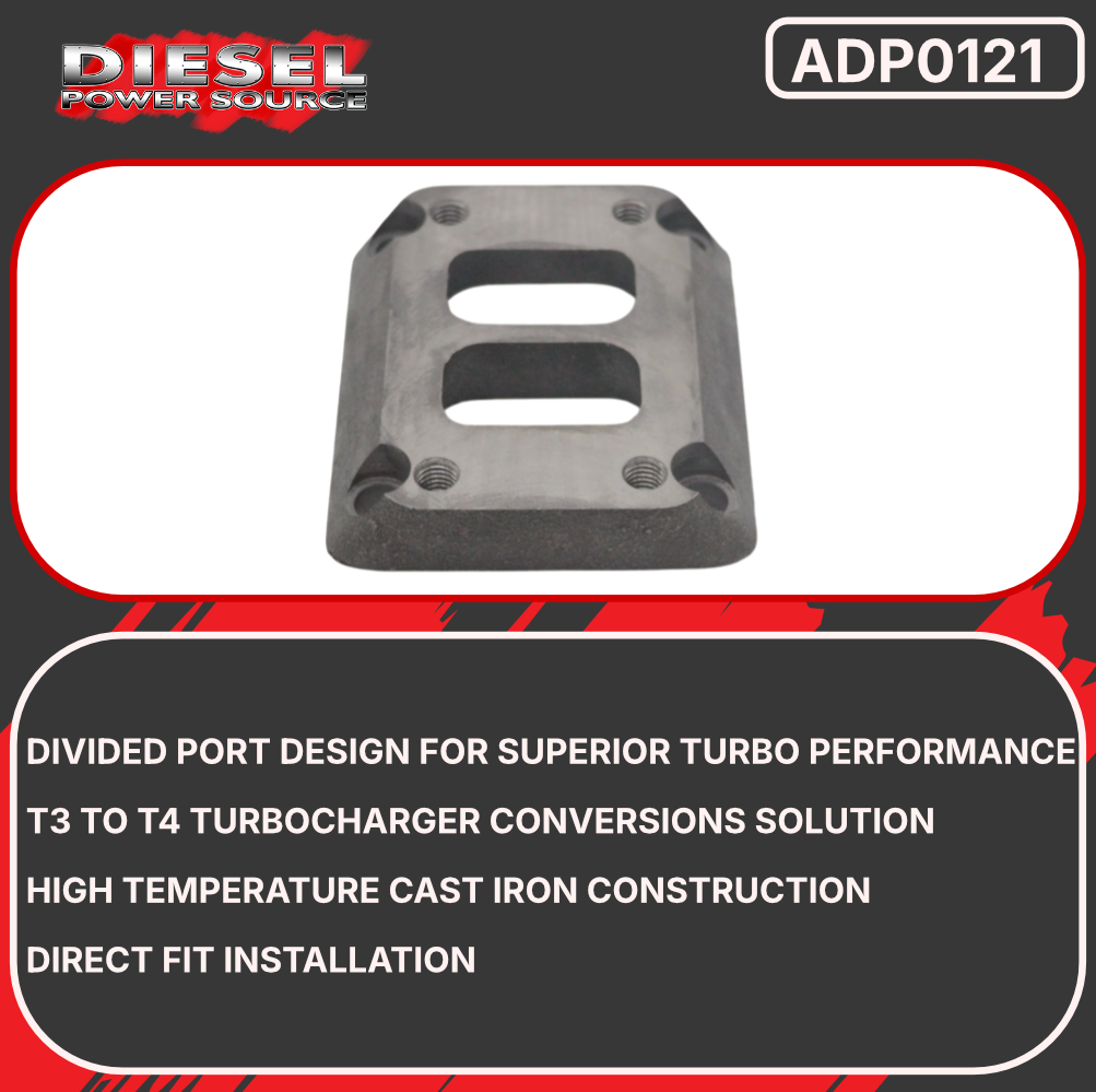 Performance Applications: Ideal for turbocharger upgrades where increased flow capacity is required but existing T3 manifold infrastructure is retained. Perfect for performance builds, diesel conversions, and custom turbo installations where T4 turbochargers offer superior flow characteristics. The divided port design makes this adapter particularly suitable for high-performance applications where turbo response and efficiency are paramount.