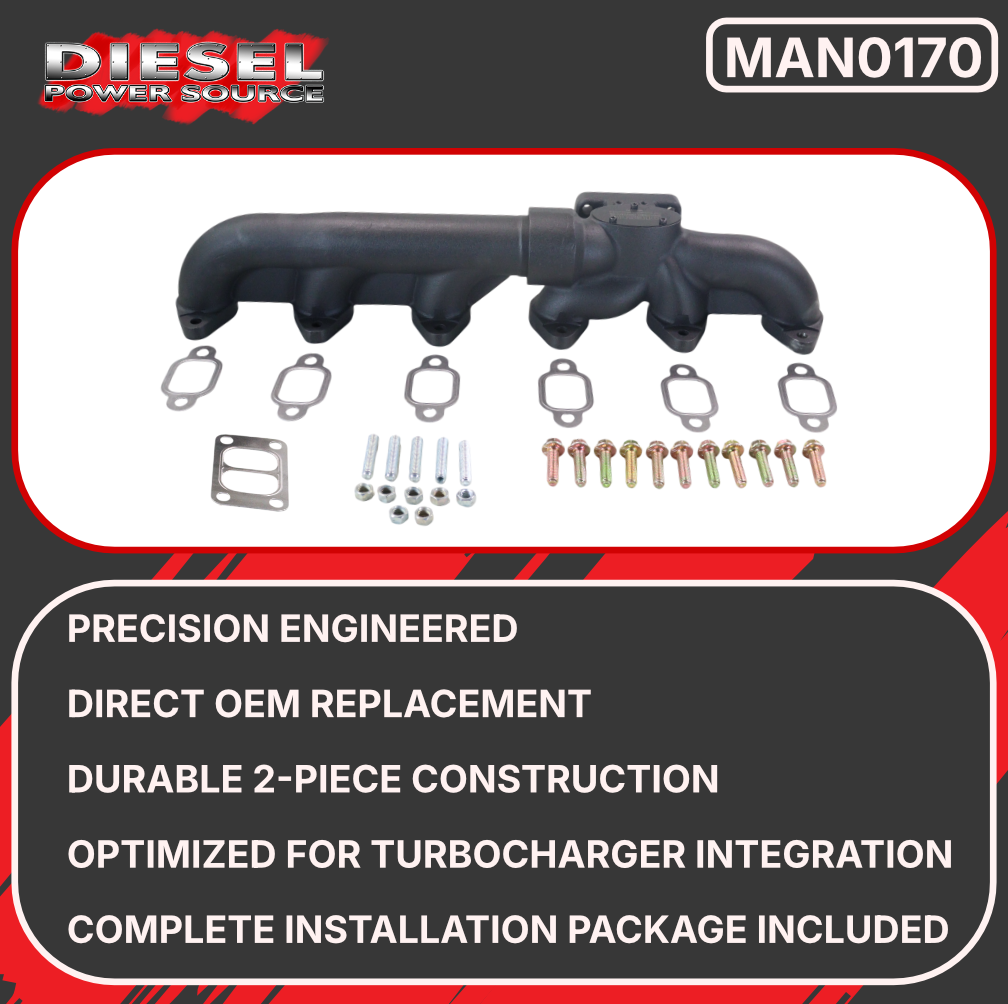 Transform your Ford Cummins swap project with the Diesel Power Source MAN0170 Fummins Exhaust Manifold, the industry-leading solution specifically engineered for 12V 5.9L Cummins engines installed in Ford truck chassis. This precision-designed 2-piece manifold system addresses the unique challenges of Fummins conversions, providing optimal exhaust flow while maintaining proper clearances for Ford-specific components including steering boxes, brake boosters, and chassis rails. The innovative split-design configuration allows for easier installation in tight Ford engine bays while delivering superior performance compared to single-piece alternatives.