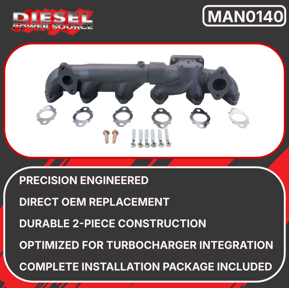 Upgrade your 2007.5-2018 Dodge Ram 6.7L Cummins with the Diesel Power Source High-Performance Exhaust Manifold, engineered to deliver superior flow characteristics and enhanced durability over factory components. This precision-cast manifold features optimized internal geometry that reduces exhaust backpressure, promoting faster turbo spool-up and improved overall engine performance. Constructed from high-grade cast iron with reinforced flanges and thick-wall design, this manifold is built to withstand the extreme temperatures and pressures of modern diesel engines while providing years of reliable service.