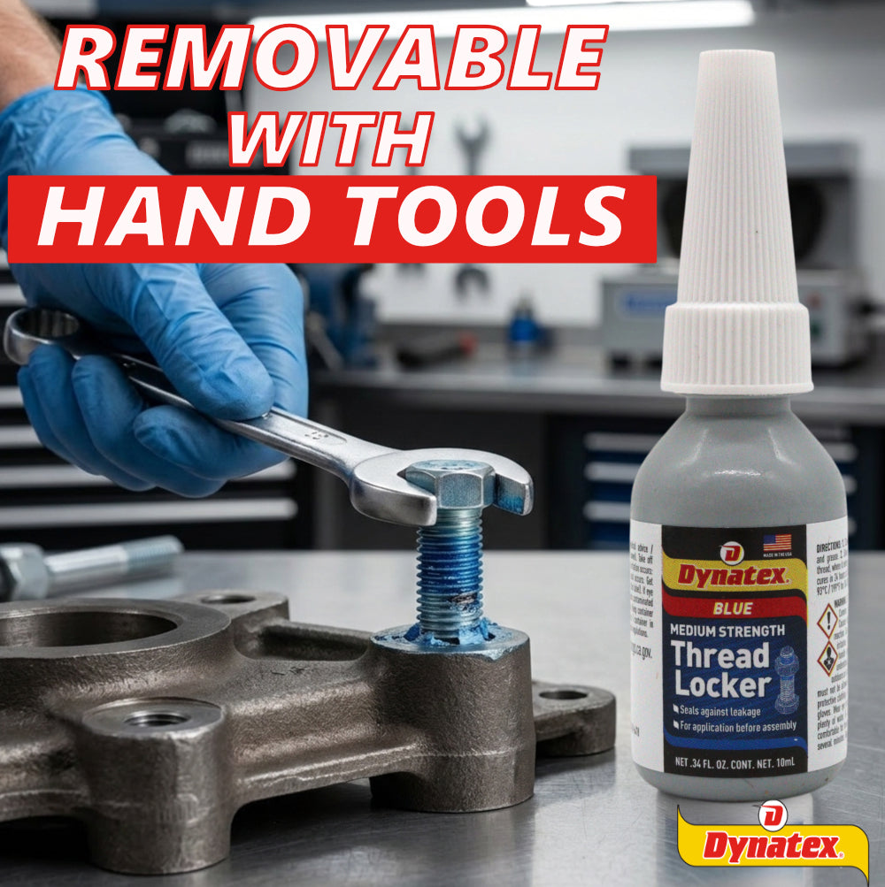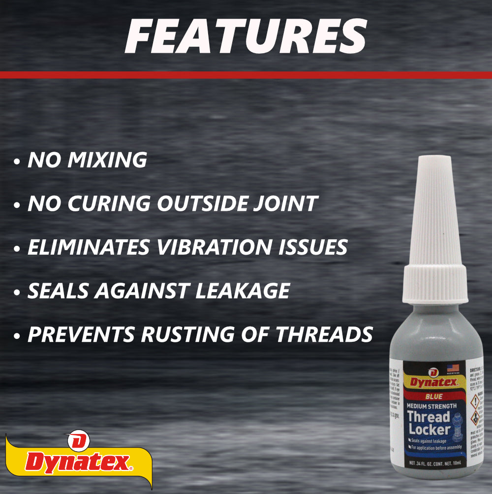 Dynatex Blue Medium Strength Threadlocker 0.34 oz Bottle - Removable with Hand Tools, Locks Fasteners on Metal, Vibration Resistant, Solvent Resistant