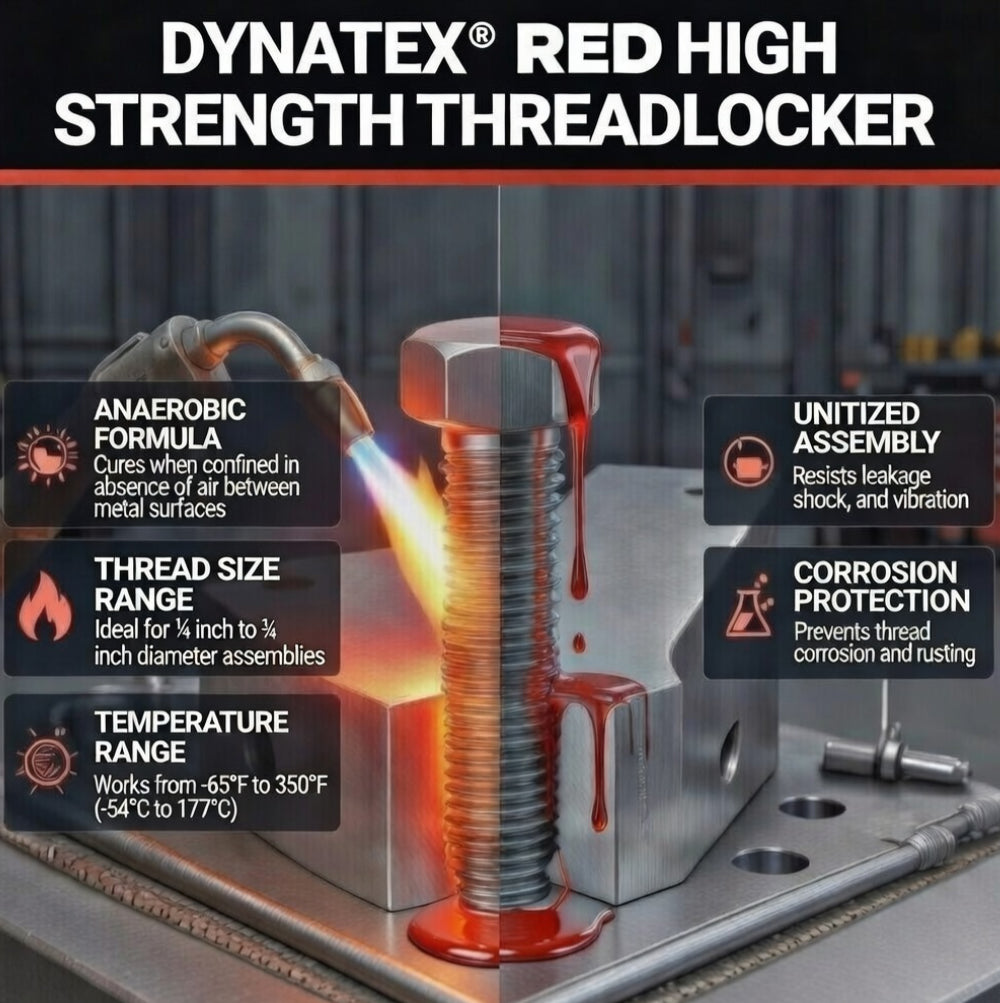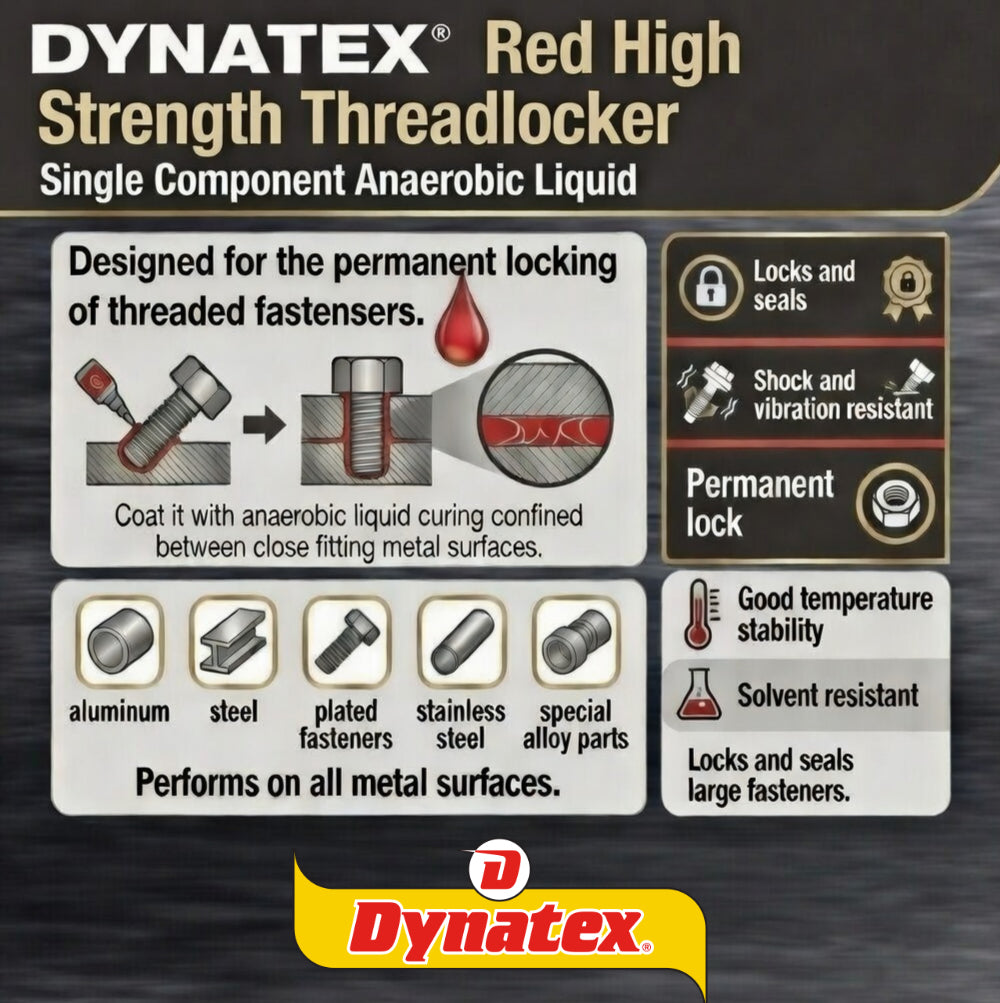 Dynatex Red High Strength Threadlocker is a single component, anaerobic liquid which cures when confined in the absence of air... Read more