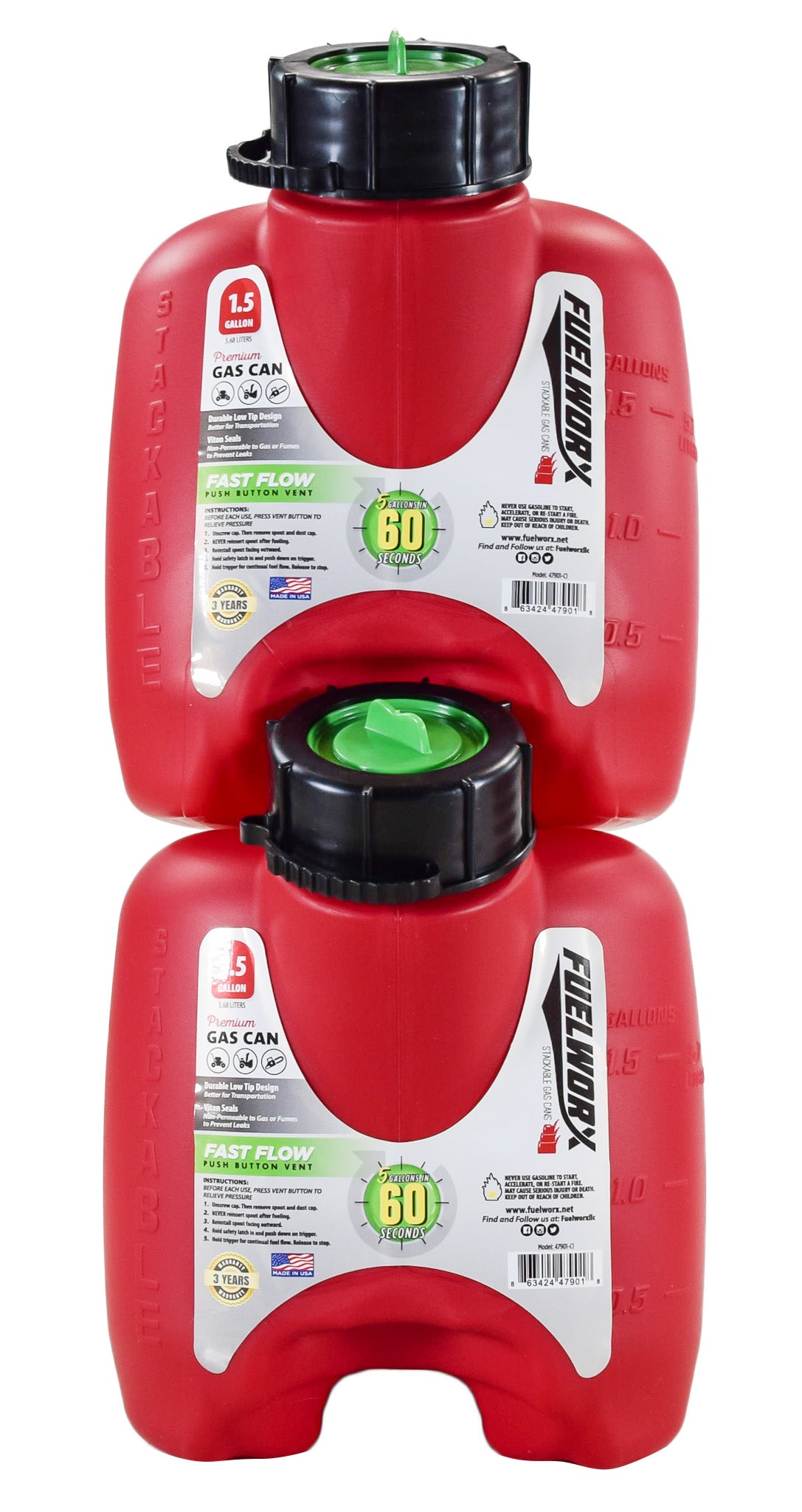 Fuelworx Red 1.5 Gallon Stackable Fast Pour Gas Fuel Cans CARB Compliant Made in The USA (1.5 Gallon Gas Can 2-Pack)