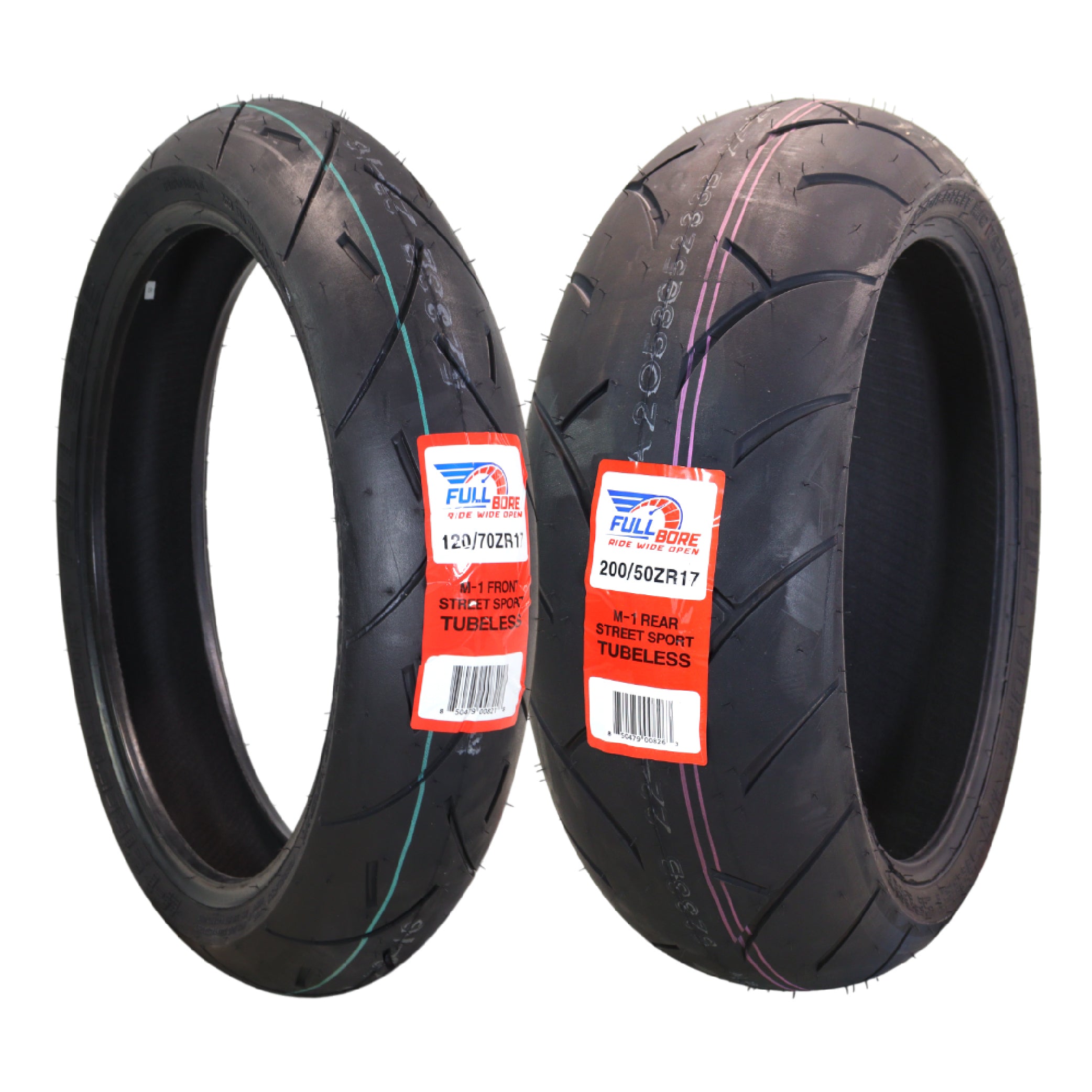 The Full Bore M1 120/70ZR17 and 200/50ZR17 (120/70-17 & 200/50-17) Front and Rear Motorcycle Tires is built for riders who demand performance, reliability, and value. Designed for street and sport bike enthusiasts, this high-performance radial tire delivers outstanding grip, responsive handling, and confident cornering, whether you're commuting, carving up back roads, or heading out for a weekend ride. With a tread pattern engineered for both dry and wet conditions, the M1 offers excellent traction and stability, even at higher speeds. Its durable construction and Z-rated performance make it a trusted choice for riders looking to upgrade their front tire without breaking the bank. At Full Bore Tires, we’re all about delivering high-quality performance tires without the premium price tag. Proudly family owned in the USA since 2008, we bring a personal touch to everything we do. Our team is made up of real riders who know what it takes to make a tire that performs when it matters most. We design our tires with a focus on grip, control, and long-lasting durability. The M1 series, for example, is perfect for riders who want that sweet spot between performance and value. We take pride in offering premium-quality tires at a competitive price point, making top-tier performance accessible to more riders without compromising safety or quality. At Full Bore, our mission is simple: to keep you riding with confidence, speed, and style. Because here at Full Bore, we don’t just ride, we Ride Wide Open.