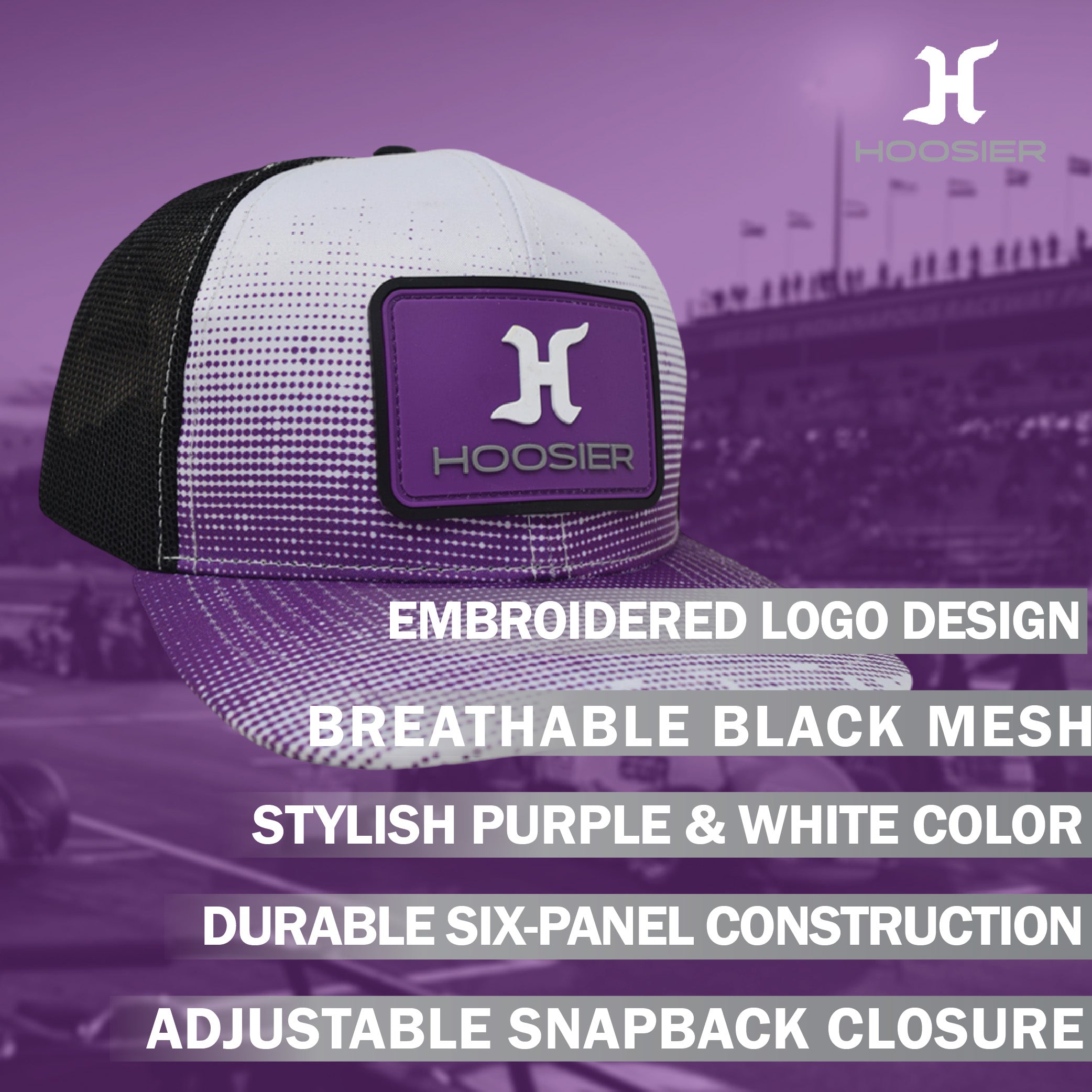 Hoosier Bumpstomp Purple & White Snapback Trucker Style Baseball Hat with Breathable Black Mesh Back & Adjustable Plastic Snapback Closure with Hoosier Keychain
