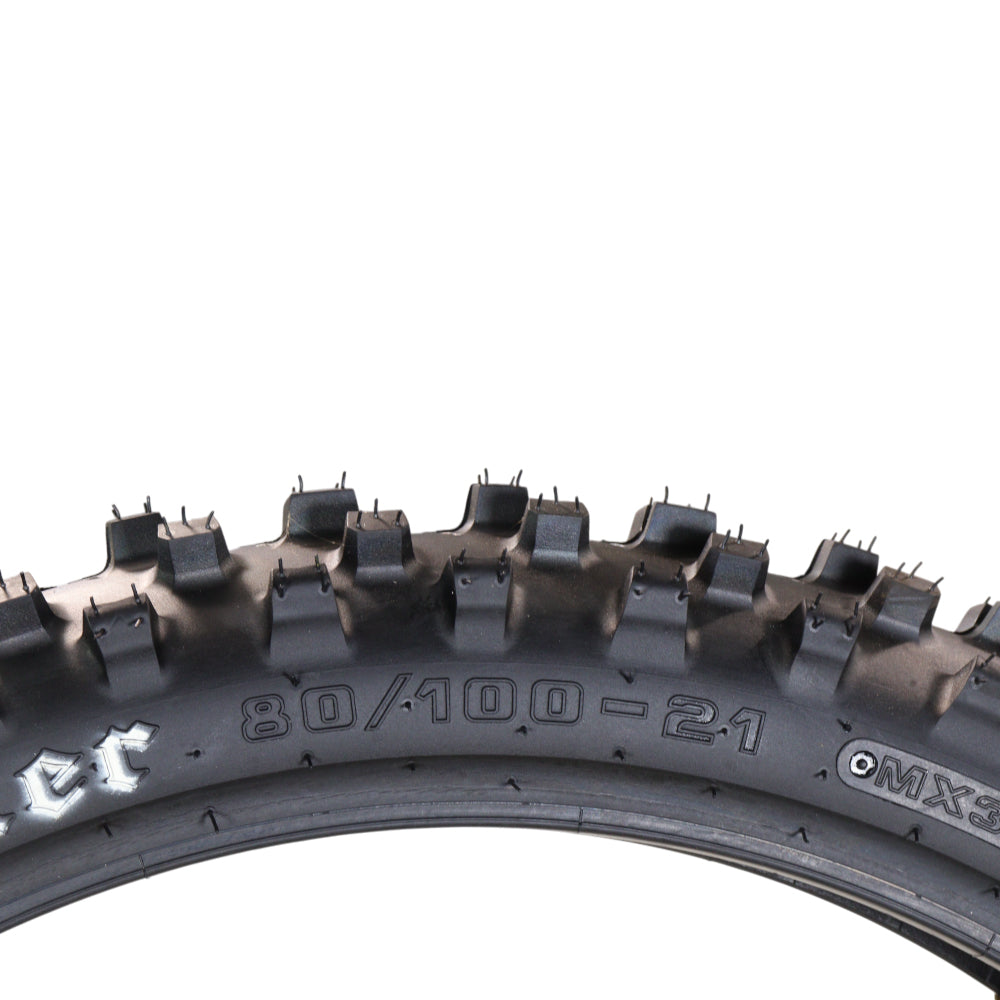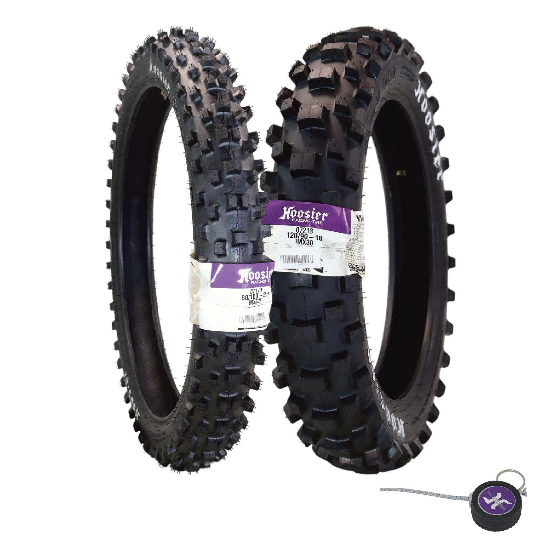 Hoosier Racing MX Tire Set: 80/100-21 MX30F Front & 120/90-18 IMX30 Rear Dirt Bike Tube Type Tires for 250, 450cc Bikes with Hoosier Keychain . Unlock your bike's full potential with the Hoosier Racing MX Tire Set, featuring the 80/100-21 MX30F front and 120/90-18 IMX30 rear dirt bike tube-type tires. Specially designed for 250cc and 450cc bikes, this tire set combines outstanding traction, durability, and control to give riders the ultimate edge on the track or trail. The 80/100-21 MX30F front tire delivers superior performance with its intermediate tread pattern, offering exceptional traction and stability across diverse terrains. Built with the advanced MX30F compound, this tire is designed to handle the demands of intense riding while ensuring precise handling and consistent cornering control. The 120/90-18 IMX30 rear tire complements the front with its intermediate tread design, providing reliable grip and stability even under challenging conditions. Engineered with the IMX30 compound, this rear tire withstands rigorous riding while maintaining high performance and longevity. Its optimized design allows riders to maintain speed, improve cornering precision, and stay ahead of the competition. Together, these tires form a powerful combination that meets the rigorous demands of competitive dirt biking. Backed by Hoosier Racing Tire's reputation for innovation and craftsmanship, this set ensures riders have the confidence and control needed to excel on any track. Complete with a Hoosier Keychain, this set adds a touch of style and functionality, making it perfect for dirt bike enthusiasts. Equip your 250cc or 450cc bike with the Hoosier Racing MX Tire Set and experience the difference in performance, reliability, and control. Trust Hoosier Racing Tire to elevate your ride and help you conquer the racecourse with confidence and speed.