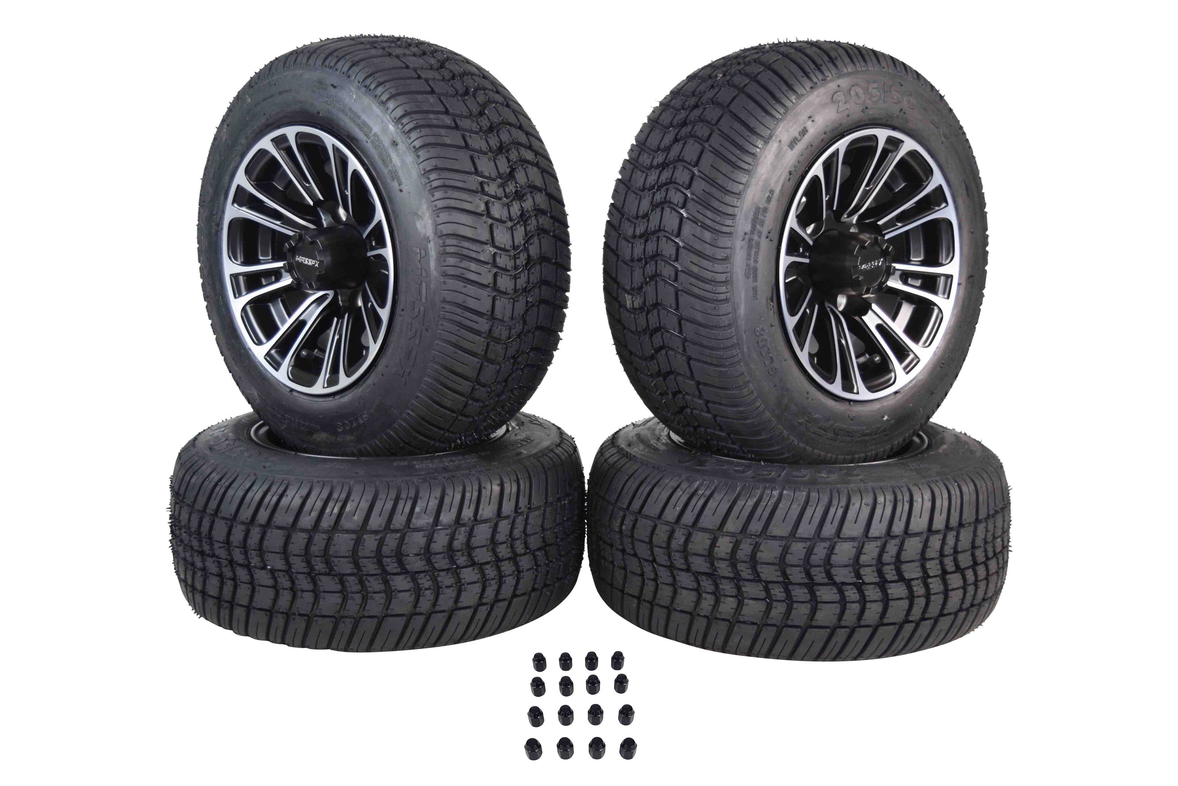 MASSFX SL 205/50-10 F/R Golf Cart, QUAKE 4 Blk Wheels 10x7 4/101.6 & 16 Blk Lugs