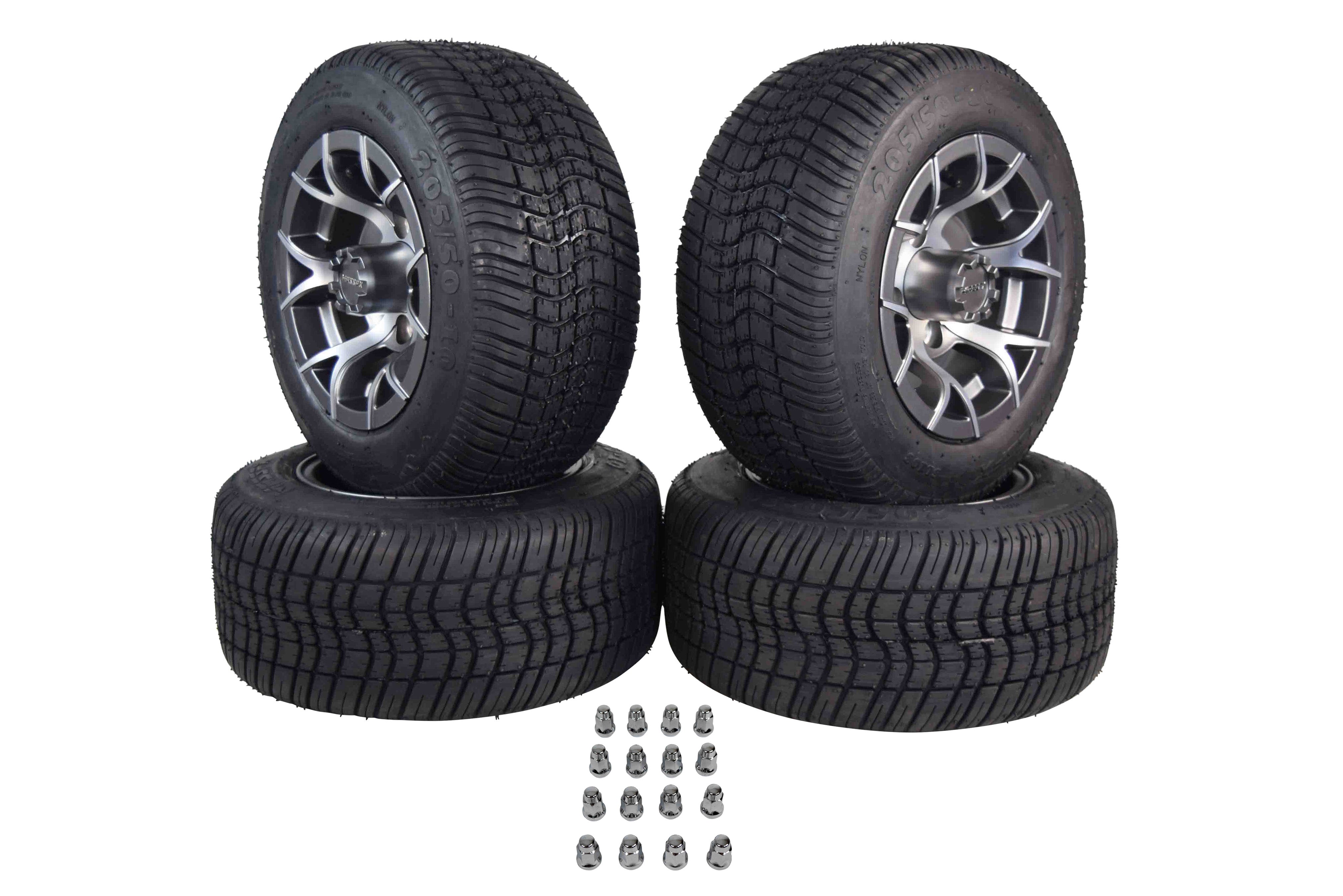 MASSFX SL 205/50-10 F/R Golf Cart, VIPER 4 GRY Wheels 10x7 4/101.6 & 16 Chr Lugs