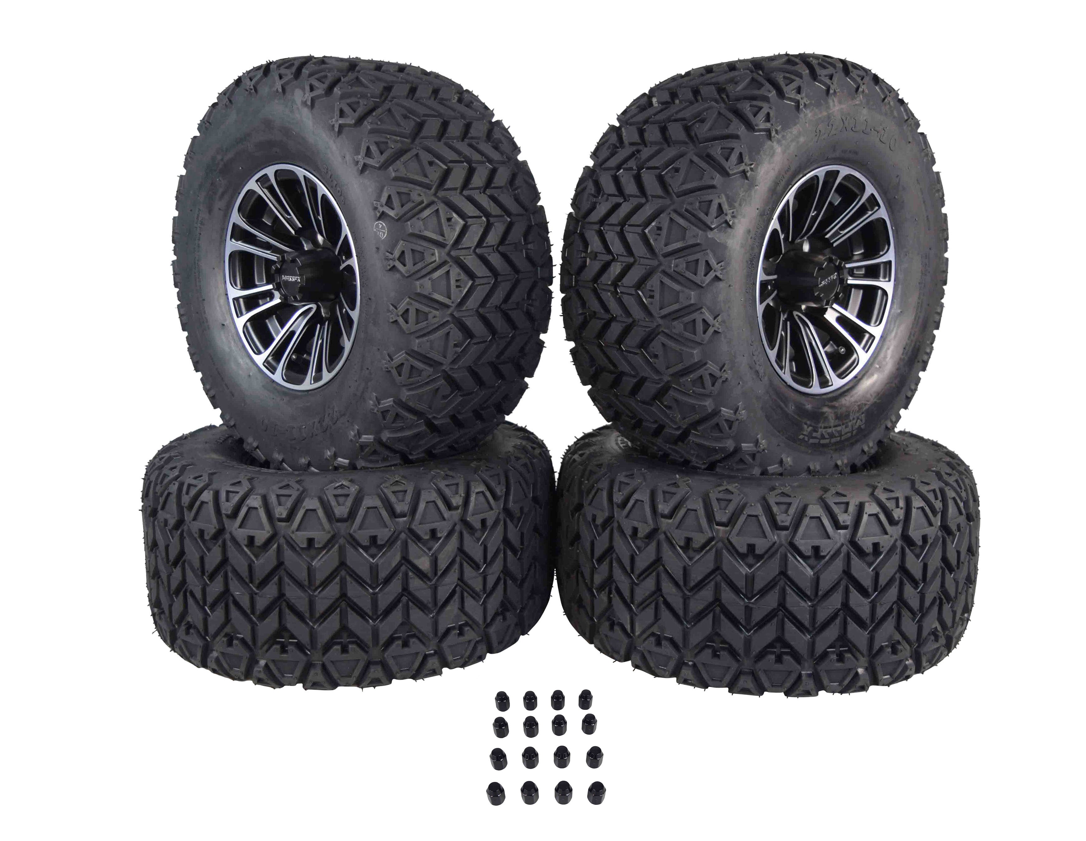 MASSFX SL 22x11-10 F/R Golf Cart, QUAKE 4 Blk Wheels 10x7 4/101.6 & 16 Blk Lugs