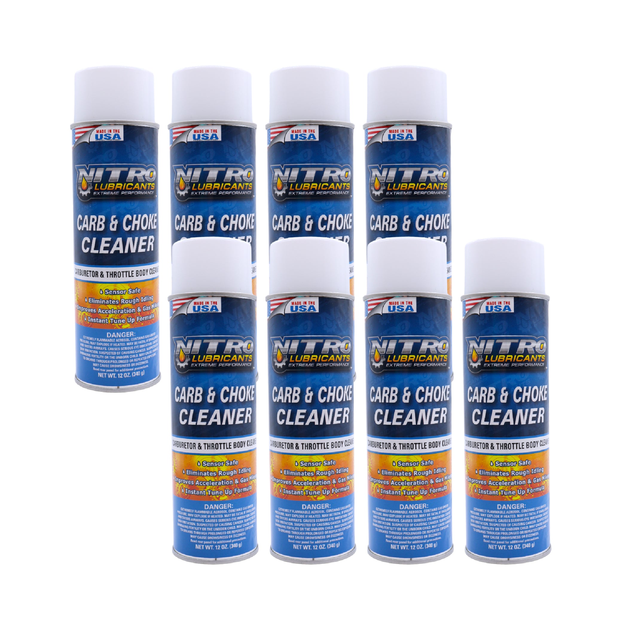 Nitro Lubricants Carb & Choke Cleaner - 12oz Sensor-Safe Formula for Removing Gum, Varnish, Carbon & Grease; Improves Idle & Acceleration in Carburetors, PCV & Linkages - Made in USA (8-Pack)