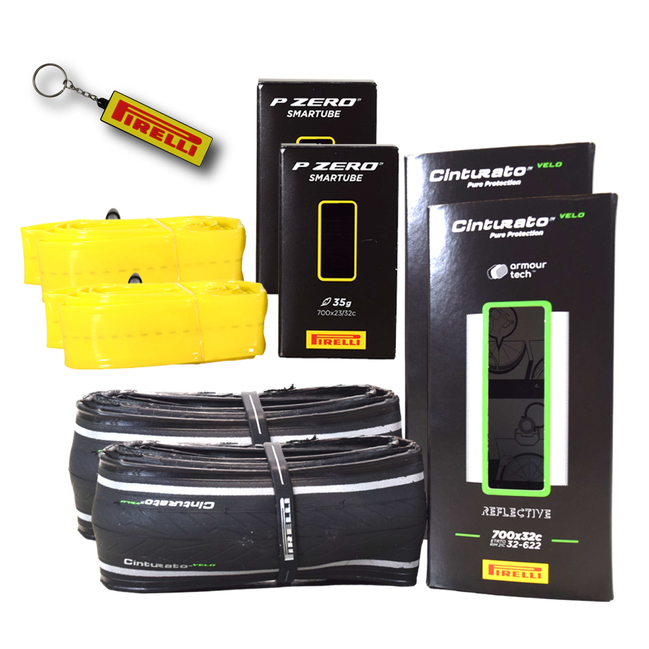 Pirelli Cinturato Velo TLR Reflective 32-622 (700 x 32c) Road Bicycle Tire & 23/32-622 Presta P ZERO SmarTUBE - Armour Tech, Clincher Type, Tubeless Ready Bike Tire with Keychain 700x32c(2-Pack Tire & Tubes)