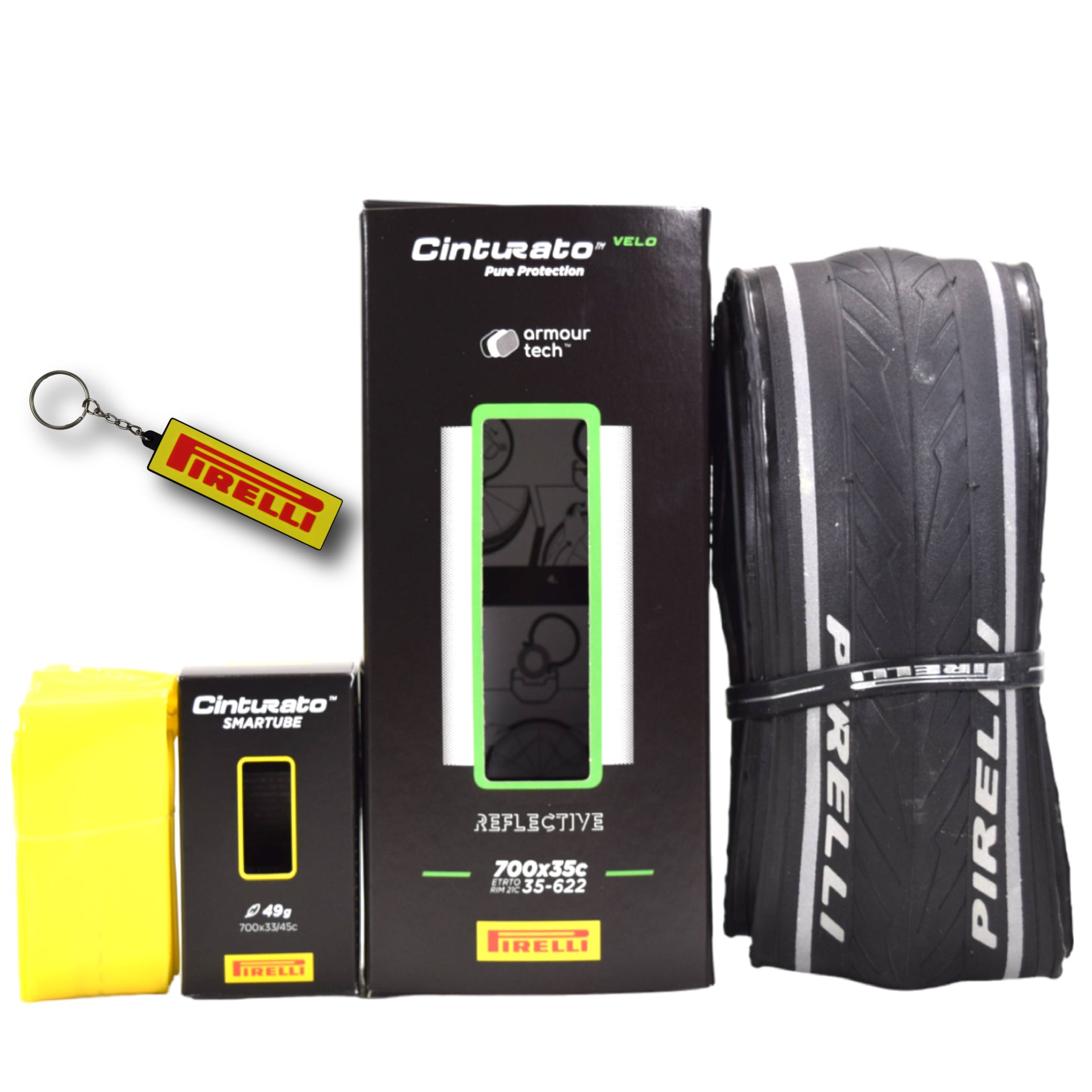Pirelli Cinturato Velo TLR Reflective 35-622 (700 x 35c) Road Bicycle Tire & 33/45-622 Presta P ZERO SmarTUBE - Armour Tech, Clincher Type, Tubeless Ready Bike Tire with Keychain 700x35c
