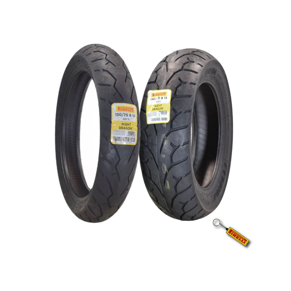 The Pirelli Night Dragon Tire Set includes the 130/70R18 M/C 63V TL front tire and the 180/70R15 M/C 76H TL rear tire, offering the perfect blend of performance, durability, and comfort, specifically designed for high-performance cruiser motorcycles. These tires fit a wide range of cruiser models, making them a versatile and practical choice for many riders.