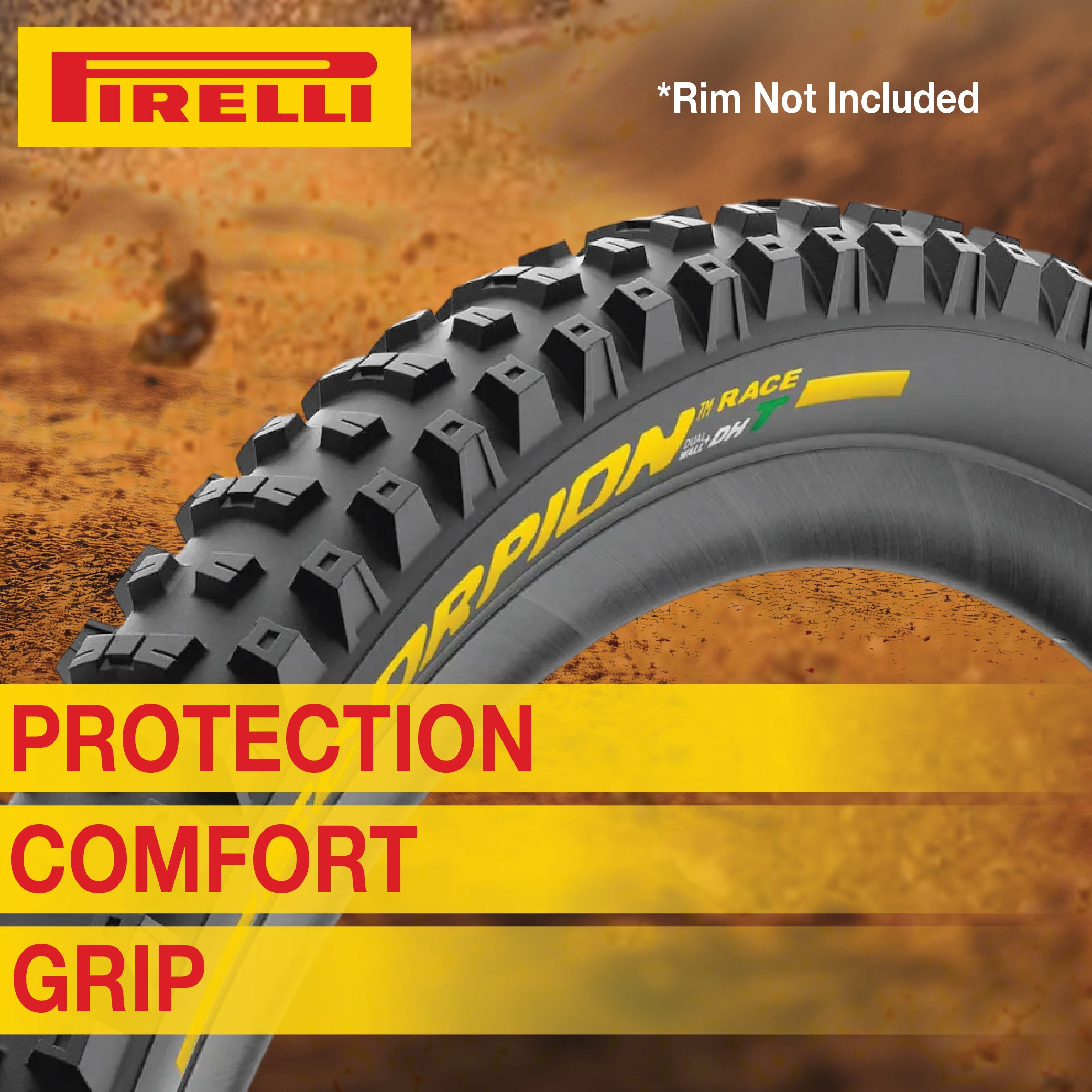 "The Pirelli Scorpion Race DH Bicycle Tire is crafted for elite downhill racers and aggressive riders conquering the most demanding Downhill courses. Engineered for maximum grip and durability, this tire features an aggressive, high-profile tread pattern optimized for soft, loose, and muddy terrains, delivering unmatched traction on challenging descents. The SmartGRIP Gravity Compound, rooted in Pirelli’s motorsport heritage, provides superior grip and control in both wet and dry conditions, ensuring precise cornering and confident braking under extreme conditions. The 60 TPI DualWALL casing, with its robust multi-layer construction, offers exceptional puncture protection and sidewall stability, making it ideal for the rigors of downhill racing. Tubeless-ready for enhanced traction and lower rolling resistance, the Scorpion Race DH ensures durability and performance on the toughest trails. Perfect for competitive DH riders and those pushing the limits, this tire is built to dominate technical downhill tracks with precision and reliability.