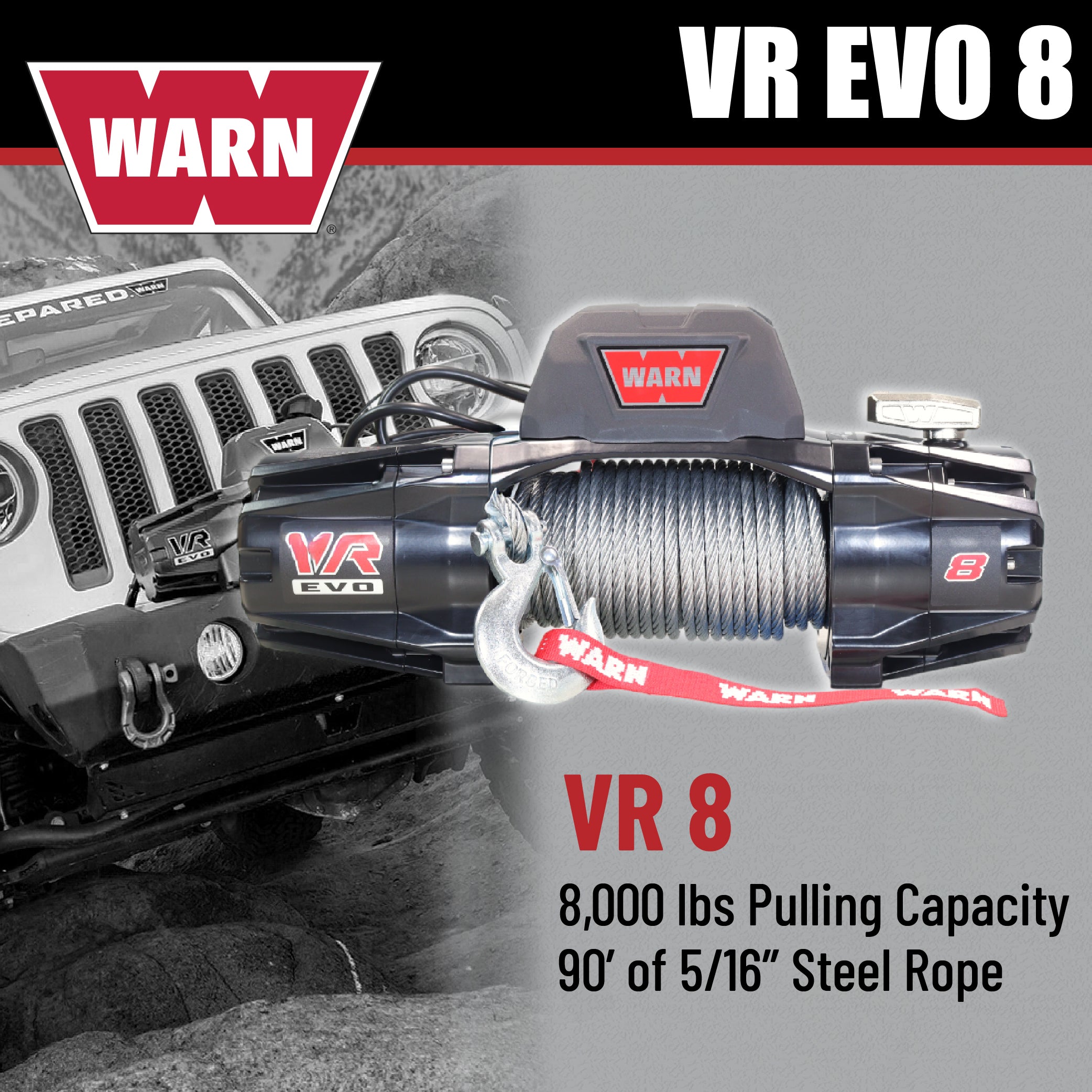WARN VR EVO 8 Standard Duty Electric Winch for 2-door Jeeps and lighter SUVs , 12V DC, 8,000 lb Line Pull, 90 ft Steel Cable with Roller Fairlead, IP68 Waterproof, Series-Wound Motor.