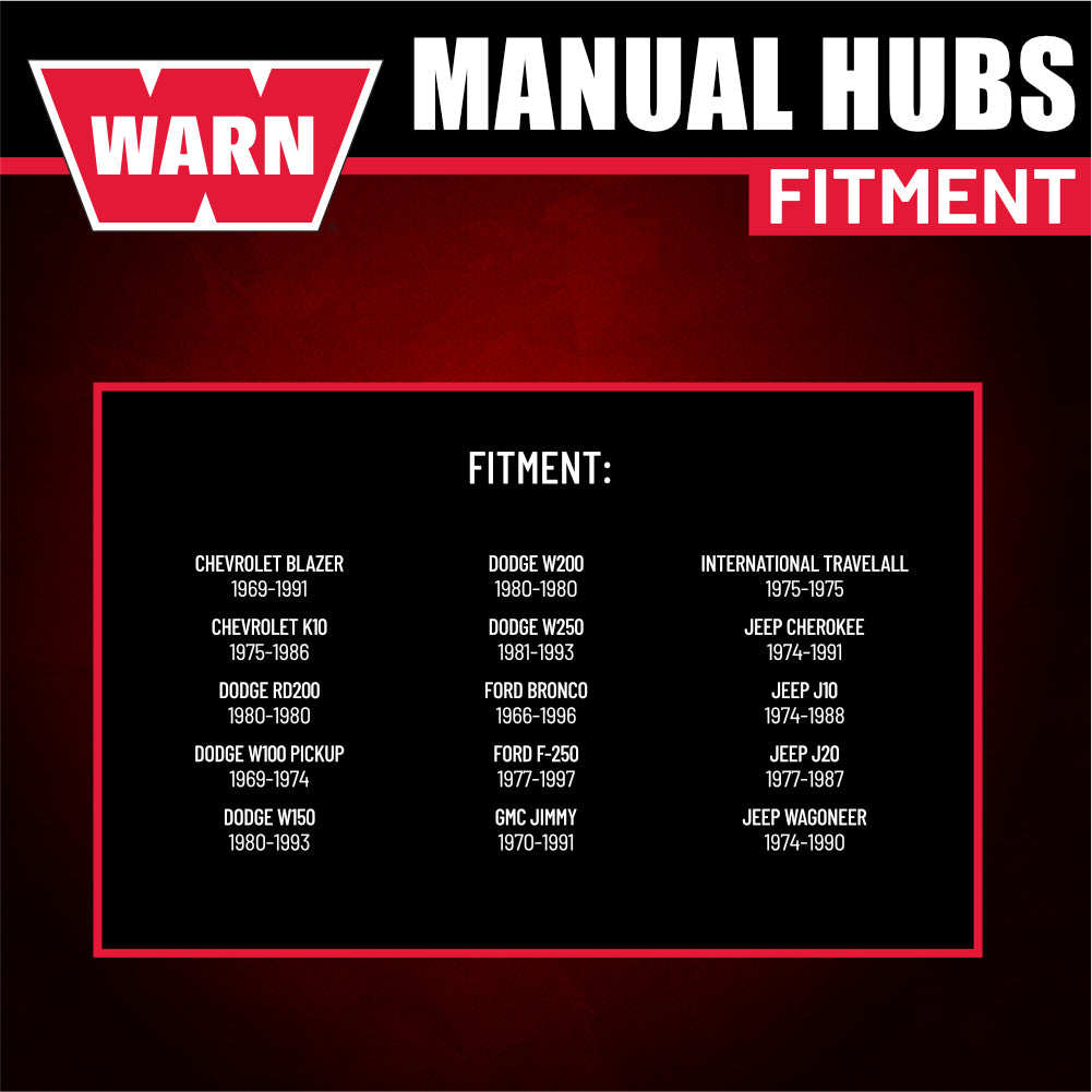 The WARN 20990 Premium Manual Locking Hubs provide dependable 4WD engagement and long‑lasting durability for vehicles requiring 19‑spline hub applications.... Read more