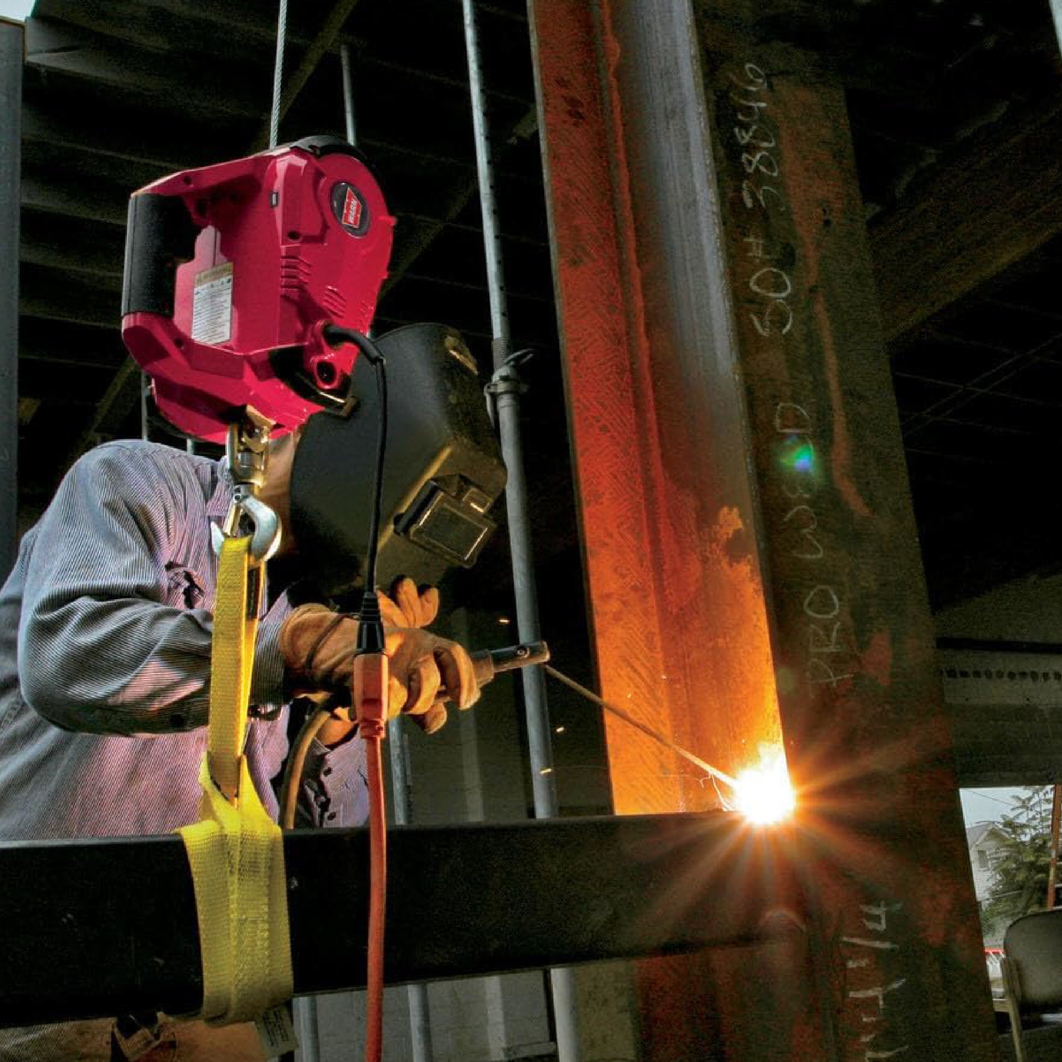 WARN 885001 PullzAll Corded 120V AC Portable Electric Winch with Steel Cable and Swiveling Anchor Hook for hoisting an engine block: 1,000 lb (1/2 Ton) Pulling Capacity, Variable Speed Control, Red