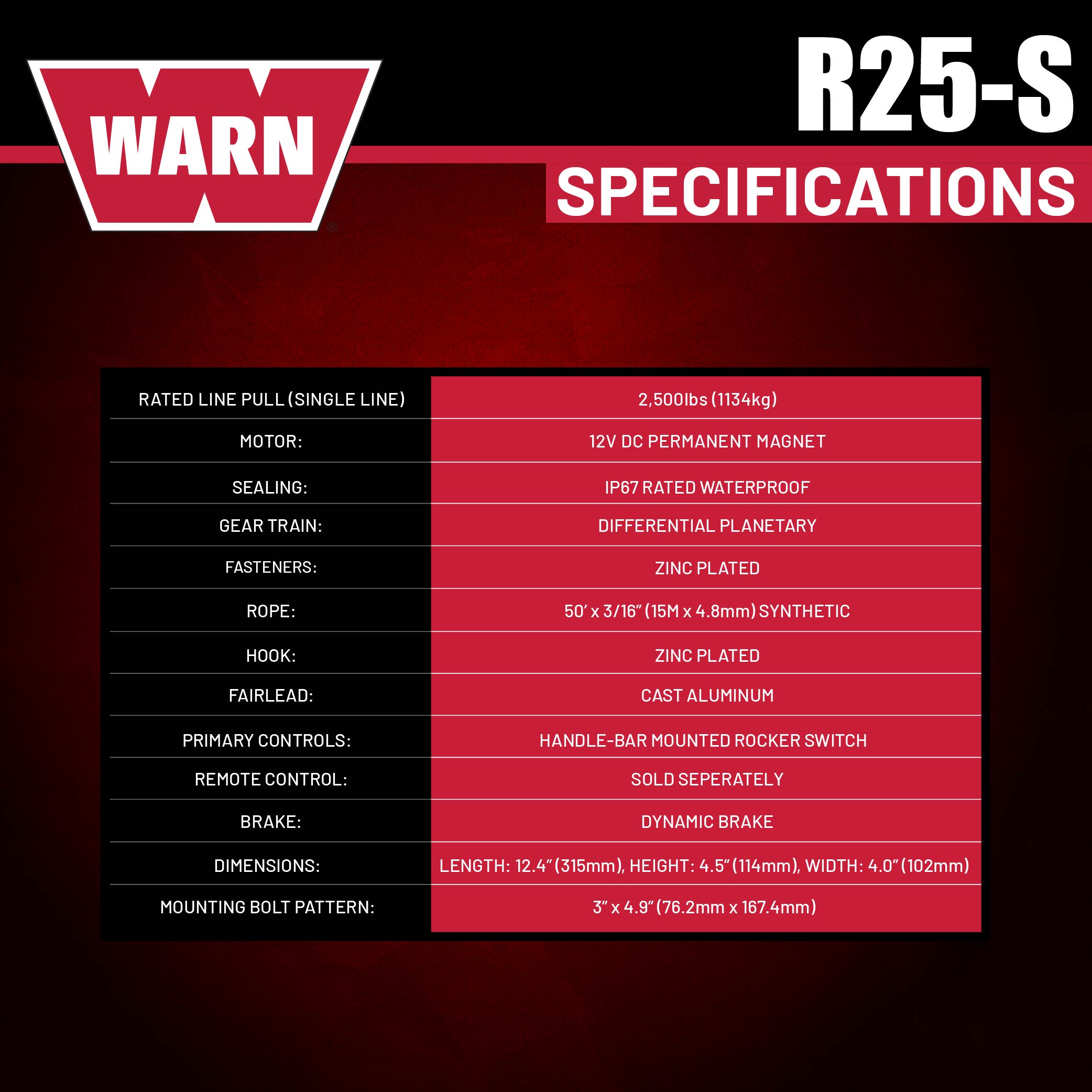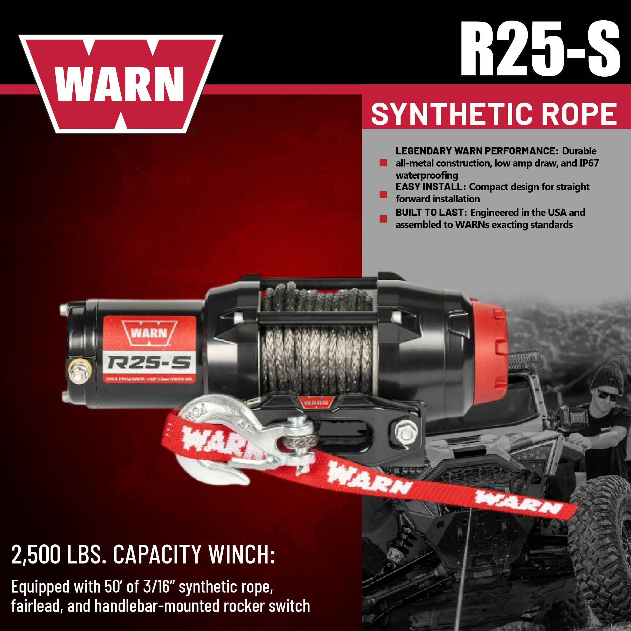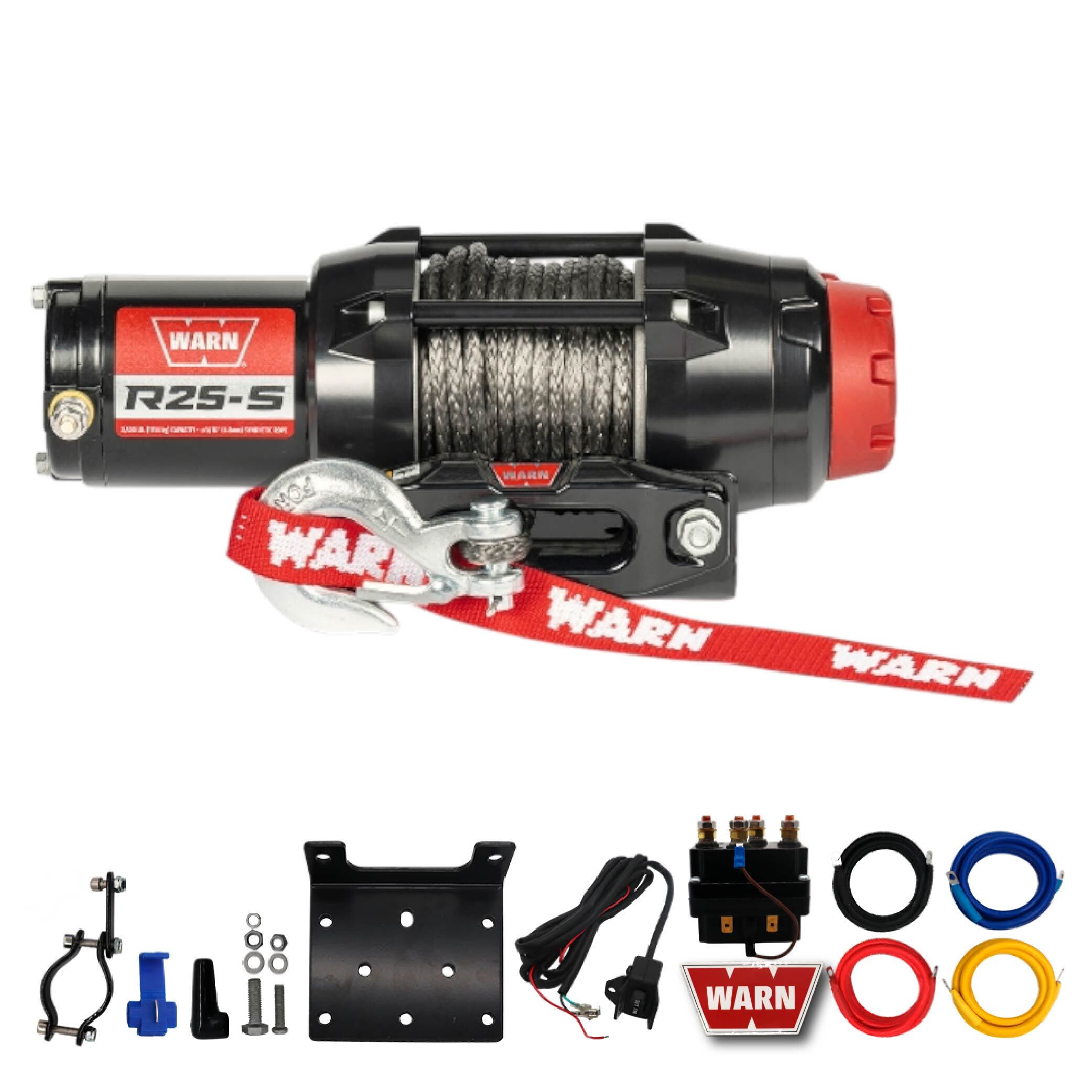 Warn R25-S Rope Winch - 2,500 lb. Pulling Capacity, equipped with 50’ of 3/16” synthetic rope & remote-mounted rocker switch - Fairlead for ATV, UTV, Side by Side, and SXS Recovery & Towing