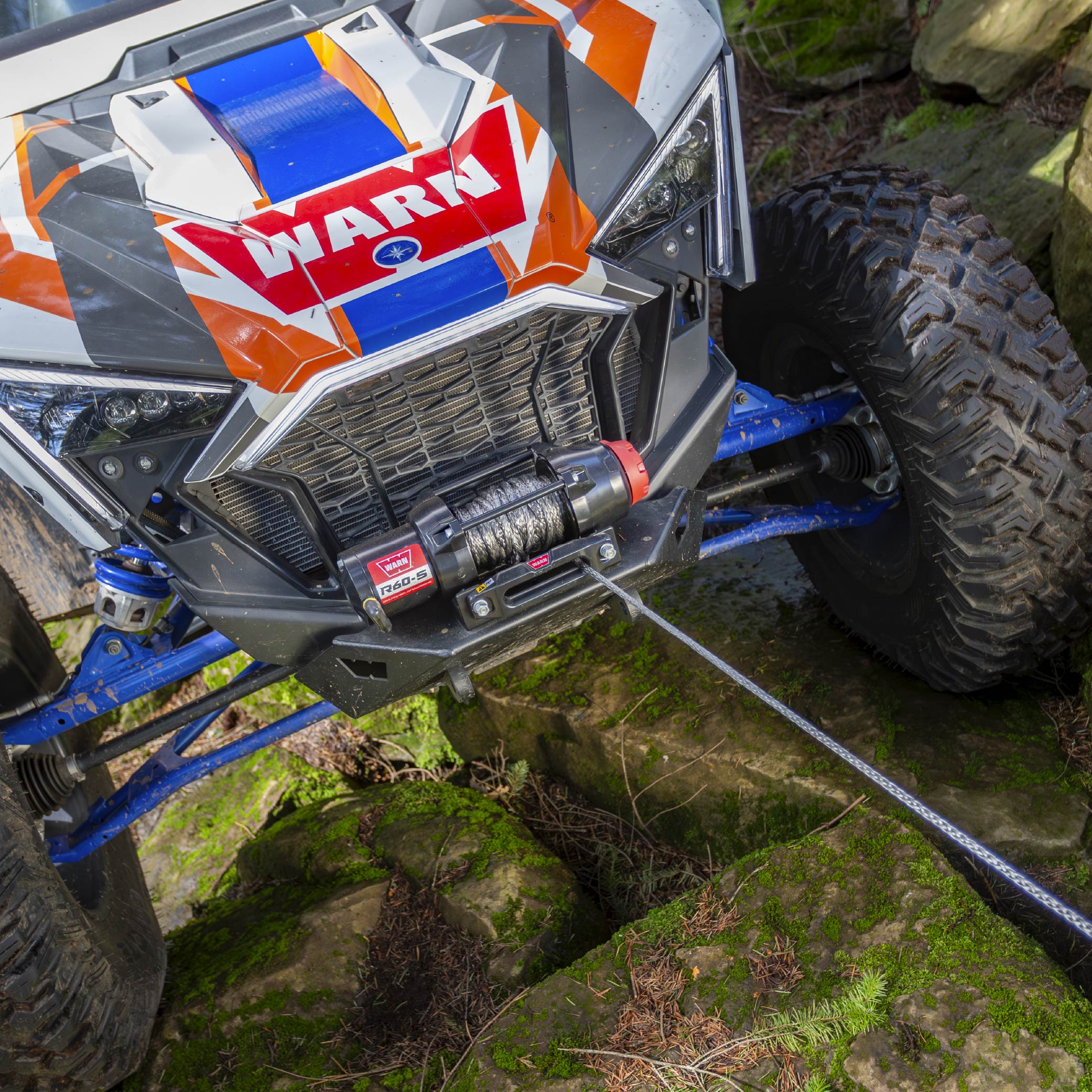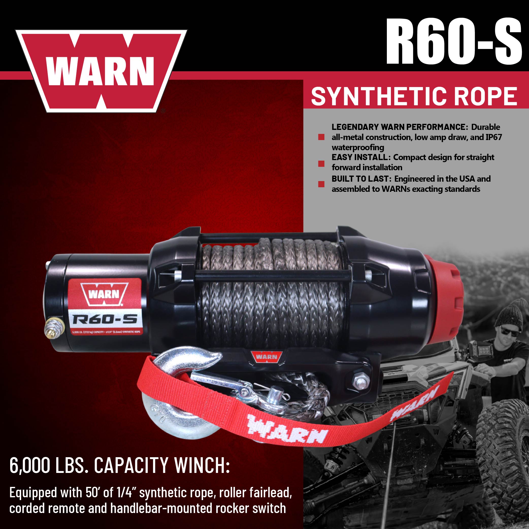 Warn R60-S Rope Winch - 6,000 lb. Pulling Capacity, equipped with 50’ of 1/4” synthetic rope & dash-mounted rocker switch - Corded Remote & fairlead for ATV, UTV, Side by Side, & SXS Recovery & Towing